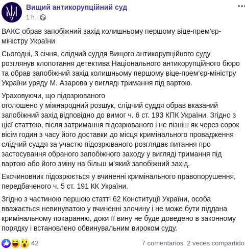 "Сегодня, 3 января, следственный судья Высшего антикоррупционного суда рассмотрел ходатайство детектива Национального антикоррупционного бюро и избрал меру пресечения бывшему первому вице-премьер-министру Украины правительства Николая Азарова в виде содержания под стражей", - говорится в сообщении
