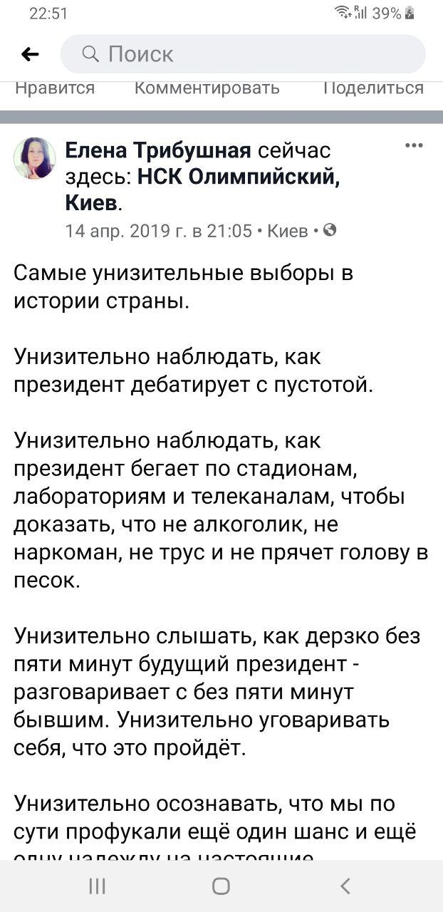 Не скрывала Трибушная своего неприязненного отношения к Владимиру Зеленскому, которого назвала "пустотой" после дебатов с Петром Порошенко.