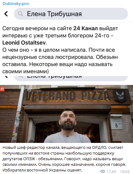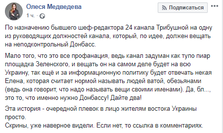 "По поводу назначения Елены Трибушной руководителем информационного вещания канала, который должен вещать на неподконтрольные территории. Уже идёт большой скандал. Трибушная была главредом канала 24. Не самого, прямо скажем, лояльного СМИ в отношении русскоязычных граждан Украины вообще и жителей Донбасса в частности. Да и сама лично Трибушная в своё время нелицеприятно отзывалась о "донецких".
