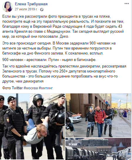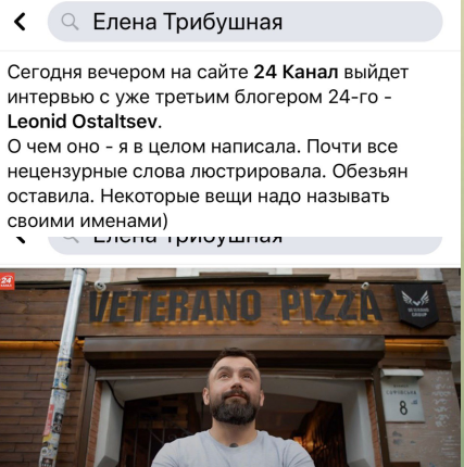 Например, об этом она написала в посте к интервью, которое она взяла у владельца Veterano Pizza и блогера 24 канала Леонида Остальцева. Говоря о результатах выборов тот заявил, что "обезьяны получили 13%" и Трибушная назвала это "называть вещи своими именами".