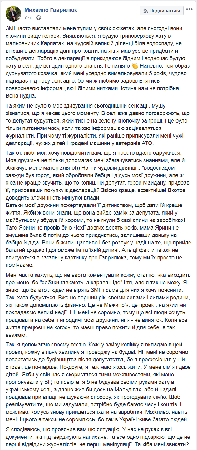 В начале поста Гаврилюк выразил обиду на журналистов, которые часто выставляют его тупым, а в связи с историей с домом еще обвинили и во лжи.