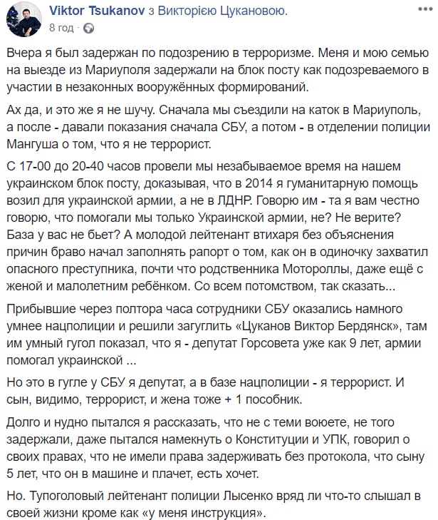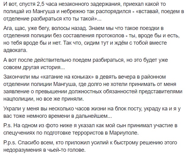 "Сначала мы съездили на каток в Мариуполь, а после - давали показания сначала СБУ, а затем - в отделении полиции Мангуша о том, что я не террорист. С 17:00 до 20:40 мы провели незабываемое время на нашем украинском блокпосту, доказывая, что в 2014 я гуманитарную помощь возил для украинской армии, а не в "ЛДНР", - написал он.