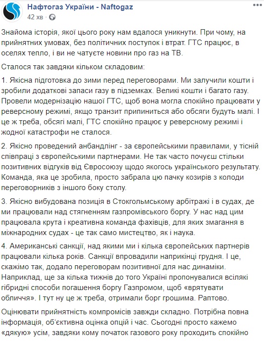 По словам представителей компании, первым фактором, который помог избежать таких проблем, является качественная подготовка к зиме перед переговорами: "Мы привлекли средства и сделали дополнительные запасы газа в подземках. Большие средства и много газа. Провели модернизацию нашей ГТС, чтобы она могла спокойно работать в реверсном режиме, если транзит прекратится или объемы будут малы. И надо же, объемы малые, ГТС спокойно работает в реверсном режиме и ни одной катастрофы не произошло."