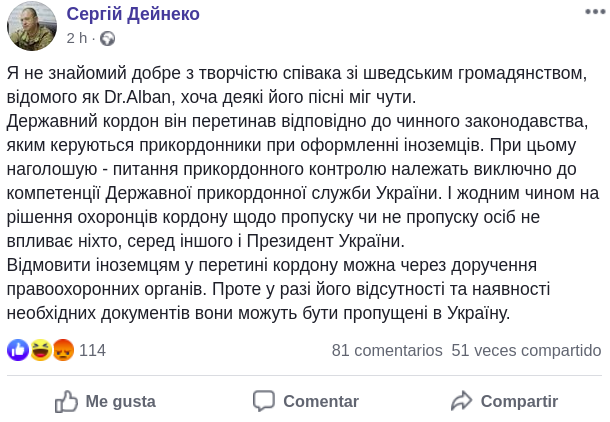 Глава Госпогранслужбы опубликовал эту запись после того, как шведский певец Dr. Alban написал о том, что ему помог въехать в Украину президент Украины Владимир Зеленский.