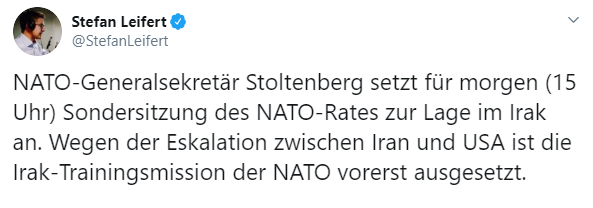 Генеральный секретарь Йенс Столтенберг заявил, что Североатлантический альянс созывает экстренное заседание из-за ситуации на Ближнем Востоке после гибели в Ираке иранского генерала Касема Сулеймани. Об этом сообщает корреспондент ZDF Штефан Лейферт.