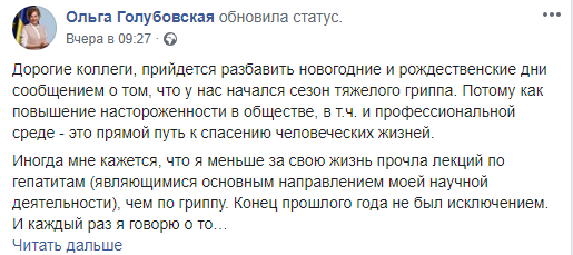 "Никто не может знать, переживет ли он этот сезон или нет. Потому что грипп – непредсказуем, потому что все развивается очень быстро, потому что нет должной настороженности в начале сезона, потому что все забывается, а сейчас еще и потому, что ограничен доступ к медицинской помощи, в связи с чем пациенты долго болеют дома. Иногда – непростительно долго. Страшно, когда буквально за несколько дней мы теряем молодых, активных людей от потенциально предотвратимого состояния", – сообщила она в Facebook.