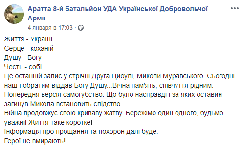 "Наш собрат отдал Богу душу ... Вечная память, соболезнования родным. Предварительная версия самоубийство. Что было на самом деле и при каких обстоятельствах погиб Николай, установит следствие", - говорится в сообщении на странице 8-го батальона УДА  "Аратта" в Facebook.
