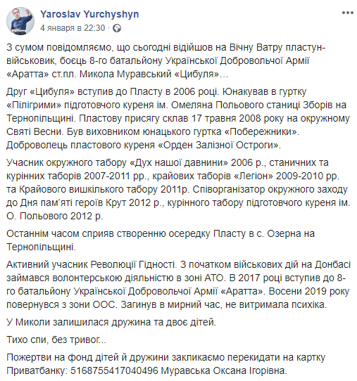 Также он уточнил, что Николай Муравский был активным пластуном с 2006 года. В последнее время способствовал созданию ячейки Пласта в своем родном селе. Также Муравский был активным участником Евромайдана. С началом военных действий на Донбассе занимался волонтерской деятельностью в зоне АТО, а в 2017 году поступил в 8-й батальон Украинской добровольческой армии "Аратта". Осенью 2019 вернулся из зоны ООС. У Николая осталась жена и двое детей.