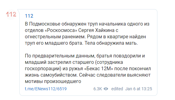 В России погиб начальник одного из отделов Роскосмоса Сергей Хайкин. ЧП произошло в Подмосковье, где в квартире были обнаружены два трупа с огнестрельными ранениями. Как выяснилось, один из убитых - сотрудник Роскосмоса, а второй - его младший брат. Об этом сообщает телеграм-канал "112".