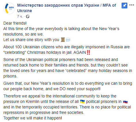 "Около 100 граждан Украины, которые незаконно находятся в заключении в России, "празднуют" рождественские праздники в тюрьме. Снова. Некоторые из украинских политзаключенных были освобождены и вернулись домой к своим семьям и друзьям, но они не могли видеть своих близких много лет и "отмечали" в тюрьмах много праздников", - говорится в сообщении.