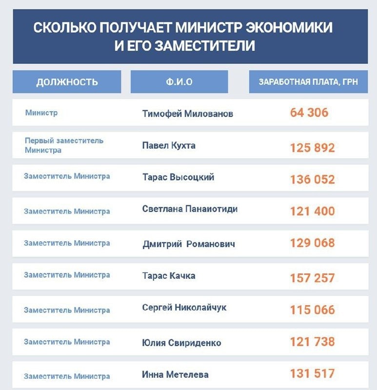 При этом Милованов получил меньше своих заместителей. Так, например, оклад заместителя министра - торгового представителя Украины Тараса Качки составила 157,3 тыс. гривен, Тарас Высоцкий получил 136 052 гривен, а Инна Метелева, которая является экс-замом Милованов получила за ноябрь 131,5 тыс гривен заработной платы.