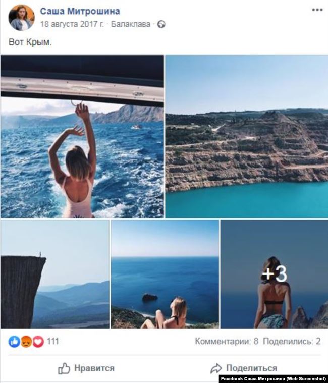 Что касается Крыма, то, судя по фото, опубликованных в ее блоге, в 2017 году Митрошина отдыхала в Балаклаве.