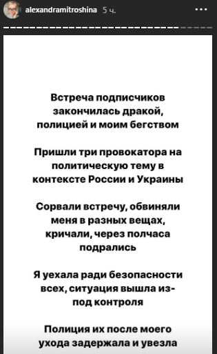 "Пришли три провокатора на политическую тему в контексте России и Украины. Сорвали встречу, обвиняли меня в различных вещах, кричали, через полчаса подрались. Я уехала ради безопасности всех, ситуация вышла из-под контроля. Полиция их после моего ухода задержала и увезла", - рассказала Александра.