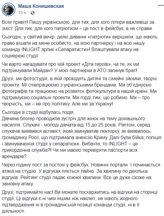 "Сегодня, в сочельник, некоторые диванные "патриоты" решили, что имеют право вешать на меня лично, на мою партнершу и на всю нашу команду INLIGHT ярлык "Сепаратисты"! Устроили атаку на соцсети студии.