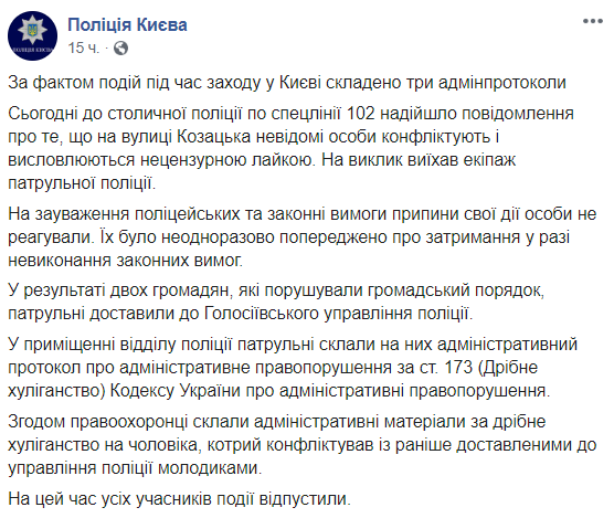 "На требование полицейских прекратить свои действия лица не реагировали. Их неоднократно предупреждали о задержании... В результате двух граждан, которые нарушали общественный порядок, патрульные доставили в Голосеевское управление полиции", - говорится в сообщении ведомства.