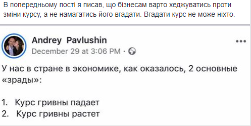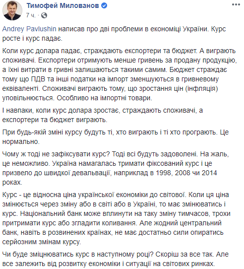 Министр развития экономики, торговли и сельского хозяйства Тимофей Милованов, который признал, что Украина беднее коммунистической Кубы, не смог дать однозначный прогноз о курсе национальной валюты по отношению к доллару в 2020 году. Он заявил, что курс - это относительная цена украинской экономики по отношению к мировой и что "никто не может угадать курс". Об этом он написал на своей странице в Facebook.