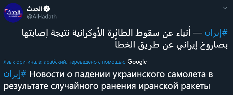 7:44 Возвращаясь к истории, что самолет погиб якобы от иранской ракеты. Эта информация пошла из Твиттера палестинского агентства "Аль-Хадат". Однако на сайте этого СМИ ее найти не удалось.