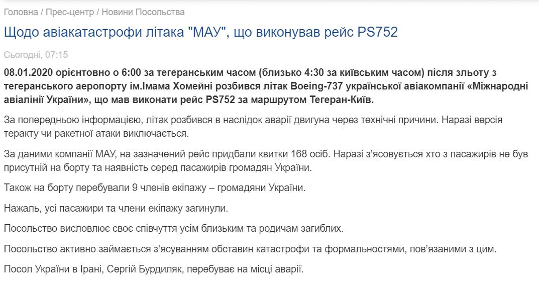12:20 На сайте посольства Украины в Иране появился отредактированный текст о катастрофе. Там уже нет слов о том, что это не теракт и не ракета.