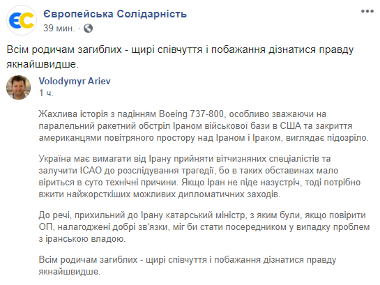 Партия "Европейская солидарность" Петра Порошенко намекает, что украинский самолет рейса PS752, который летел в Киев из Тегерана, мог сбить Иран и предлагает, "скорее узнать правду". Об этом говорится на странице "Европейской правды" в Facebook.