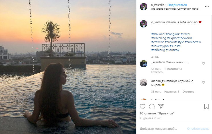 Валерия Овчарук. Бортпроводник. В ее профиле в соцсетях указано, что родом она из Луганска, живет в Киеве. Девушка публиковала фото из США, Канады, Индии, Италии, Китая, Таиланда, Грузии.