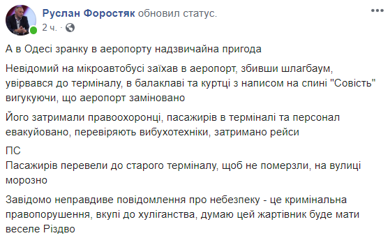 Между тем советник начальника Главного управления полиции в Одесской области Руслан Форостяк сообщил, что сообщивший о минировании аэропорта уже задержан. "В Одессе в аэропорту чрезвычайное происшествие. Неизвестный на микроавтобусе, сбив шлагбаум, заехал в аэропорт, ворвался в терминал в балаклаве и куртке с надписью на спине "совесть" и начал кричать, что аэропорт заминирован. Его задержали правоохранители. Заведомо неправдивое сообщение об опасности - это уголовное правонарушение, вместе с хулиганством, думаю, у этого шутника будет веселое Рождество", - написал он в своем Facebook.