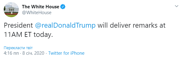 Президент США Дональд Трамп выступит с заявлением касательно конфликта с Ираном в 18:00 по Киеву.