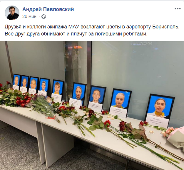 "Друзья и коллеги экипажа МАУ возлагают цветы в аэропорту Борисполь. Все друг друга обнимают и плачут за погибшими ребятами", - написал Павловский в соцсети.