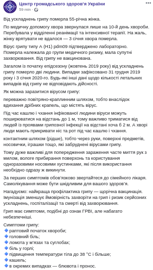 "От осложнений гриппа умерла 55-летняя женщина. За медицинской помощью больная обратилась лишь на 10-й день болезни. Находилась в отделении реанимации и интенсивной терапии. К сожалению, женщину спасти не удалось - 3 января больная умерла", - сказано в сообщении Центра на странице в Facebook в среду.