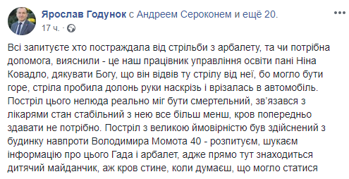"Все спрашиваете кто пострадал от стрельбы из арбалета, и нужна ли помощь, выяснили - это наша сотрудница управления образования Нина Ковадло, слава Богу, что он отвел ту стрелу от нее, могло быть горе, стрела пробила ладоней руки насквозь и врезалась в автомобиль ", - написал Годунок.