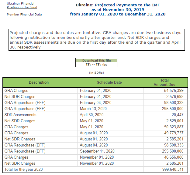 Украина должна выплатить МВФ 999 648 млн специальных прав заимствования (SDR). По курсу НБУ на начало января это соответствует сумме около 1,38 миллиарда американских долларов. При этом первый платеж в примерно 75 млн долларов запланирован уже на 1 февраля. Наибольшие же платежи эквивалентом в 409 млн долларов каждый должны быть осуществлены 13 марта и 11 сентября 2020 года.