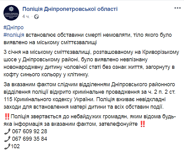 Полиция Днепропетровской области расследует обстоятельства смерти новорожденного мальчика, чье тело было найдено на городской свалке. Об этом отдел коммуникации полиции области сообщает в Facebook.