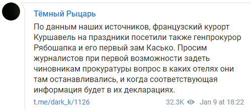 "По данным наших источников, французский курорт Куршавель на праздники посетили также генпрокурор Рябошапка и его первый зам Касько. Просим журналистов при первой возможности задать чиновникам прокуратуры вопрос, в каких отелях они там останавливались и когда соответствующая информация будет в их декларациях", - говорится в сообщении.