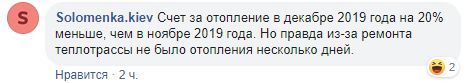 "Счет за отопление в декабре 2019 года на 20% меньше, чем в ноябре 2019 года. Но правда из-за ремонта теплотрассы не было отопления несколько дней", - пишет житель Соломенки.