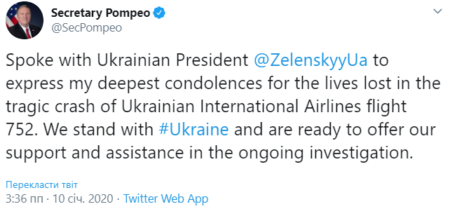 "Переговорил с президентом Украины Зеленским и выразил мои глубочайшие соболезнования в связи с гибелью людей в трагической катастрофе Украинских международных авиалиний, рейс 752. Мы поддерживаем Украину и готовы предложить нашу поддержку и помощь в предстоящем расследовании", - написал Помпео.