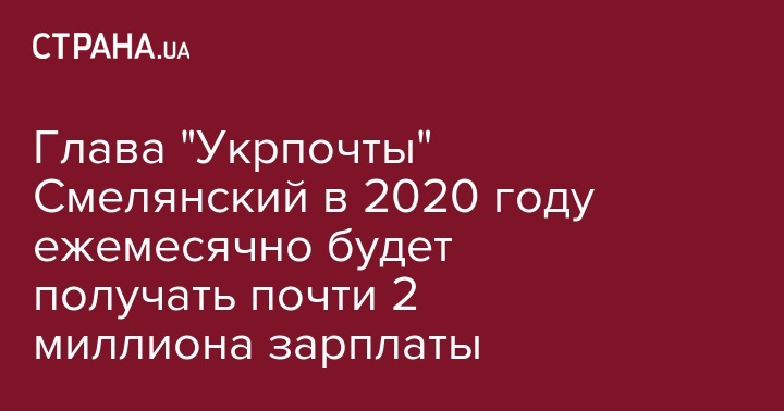 "Генеральный директор "Укрпочты" Игорь Смелянский в этом году существенно улучшит свое благосостояние. Глава почты будет  получать зарплату в размере 1 886 808 гривен 30 копеек в месяц. Из них 716 463 гривен 30 копеек - должностной оклад, 693 843 гривны 00 копеек - ежемесячная премия, 456 502 гривны 00 копеек - другие выплаты, предусмотренные законодательством", - говорится в сообщении.