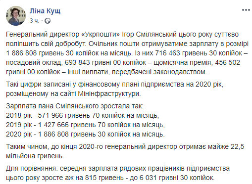 "Таким образом, до конца 2020-го генеральный директор получит почти 22,5 миллиона гривен. Для сравнения: средняя зарплата рядовых работников предприятия в этом году вырастет на целых 815 гривен - до 6031 гривны 30 копеек", - написала Лина Кущ.