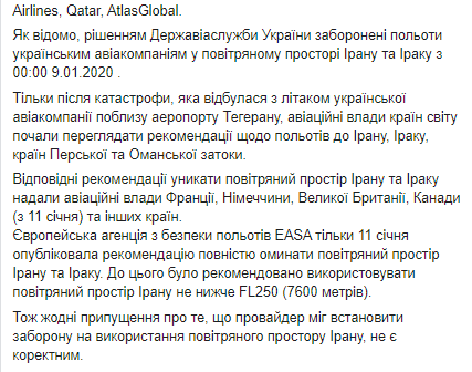 Европейское агентство по безопасности полетов EASA только 11 января опубликовало рекомендацию полностью обходить воздушное пространство Ирана и Ирака. До этого было рекомендовано использовать воздушное пространство Ирана не ниже FL250 (7 600 метров).
