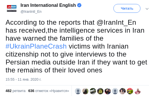 "Согласно сообщениям, полученным Iran International English, спецслужбы в Иране предупредили семьи жертв с иранским гражданством, чтобы они не давали интервью персидским СМИ за пределами Ирана, если хотят получить останки своих близких", - говорится в сообщении.