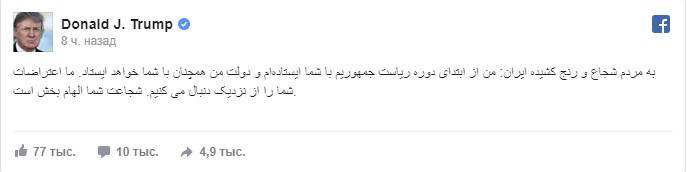 "Храброму, многострадальному народу Ирана: я был на вашей стороне от начала своего президентства и моя администрация будет продолжать выступать за вас. Мы внимательно следим за вашими протестами, и мы вдохновляемся вашей отвагой.