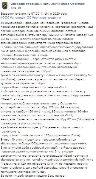 "10 января вооруженные формирования Российской Федерации 13 раз нарушили режим прекращения огня. Противник обстрелял наши позиции из запрещенных минскими договоренностями артиллерийских систем калибра 122-мм, минометов калибра 120-мм и 82-мм, а также гранатометов различных систем, крупнокалиберных пулеметов и другого стрелкового оружия… в результате вражеских обстрелов трое военнослужащих Объединенных сил получили ранения", - говорится в сообщении.