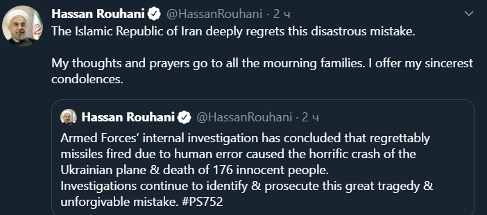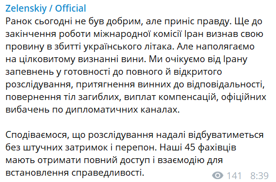 "Утро сегодня не было хорошим, но принесло правду. Еще до окончания работы международной комиссии Иран признал свою вину в сбивании украинского самолета. Но настаиваем на полном признании вины. Мы ожидаем от Ирана заверений в готовности к полному и открытому расследованию, привлечении виновных к ответственности, возвращении тел погибших, выплаты компенсаций, официальных извинений по дипломатическим каналам.