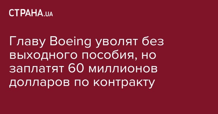 Деннис Мюленбург, которого уволили с поста главы американской корпорации Boeing после того, как у компании начались проблемы с лайнером Boeing-737 MAX, не получил выходного пособия после увольнения. Но при этом компания заплатит ему более 60 млн долларов по контракту. Об этом передает ВВС.