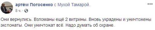 "Они вернулись. Взломаны еще 2 витрины. Вновь украдены и уничтожены экспонаты. Они уничтожат всё. Надо думать об охране", - говорится в сообщении.