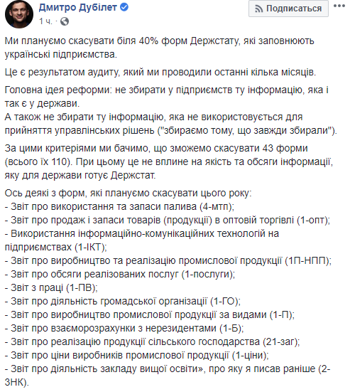 "Мы планируем отменить около 40% форм Госкомстата, которые заполняют украинские предприятия. Это является результатом аудита, который мы проводили в последние несколько месяцев", - написал он.