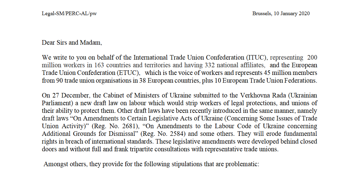 "В последнее время таким же образом были внесены и другие законопроекты, а именно проекты законов "О внесении изменений в некоторые законодательные акты Украины (относительно отдельных вопросов деятельности профессиональных союзов)" (рег. № 2681), "О внесении изменений в Кодекс законов о труде Украины о дополнительных основаниях для увольнения"(рег. № 2584) и другие. Они нарушают основополагающие права раьботников в обход международных стандартов. Эти законодательные изменения разрабатывались за закрытыми дверями без полноценных и откровенных трехсторонних консультаций с репрезентативными профсоюзами", - говорится в письме.