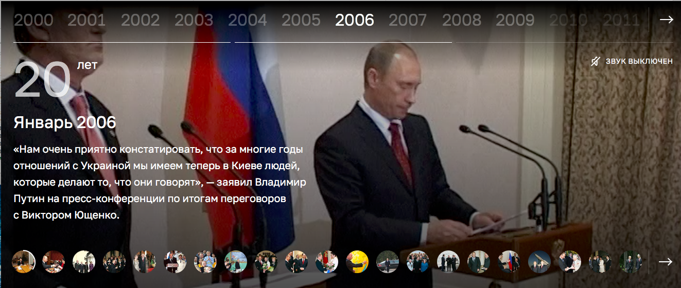 В ходе совместной пресс-конференции Путин сказал о Ющенко: "Нам очень приятно констатировать, что на многие годы отношений с Украиной мы имеем теперь в Киеве люде, которые делают то, что они говорят".