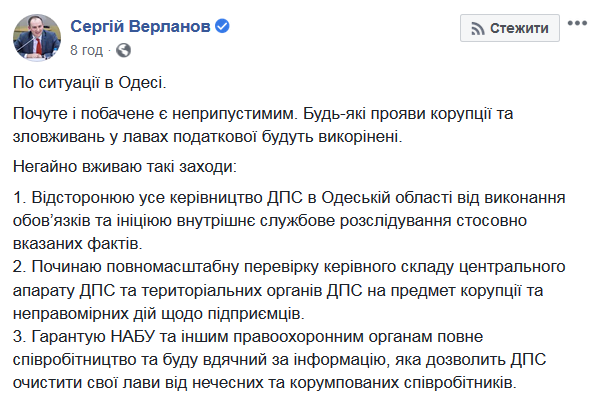 3. Гарантирую НАБУ и другим правоохранительным органам полное сотрудничество и буду благодарен за информацию, которая позволит ГНС очистить свои ряды от нечестных и коррумпированных сотрудников", - написал Сергей Верланов.
