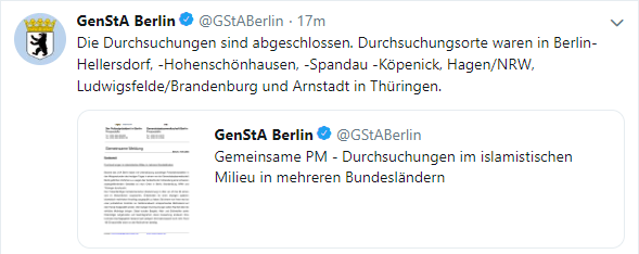 "В рамках следственных действий генпрокуратуры Берлина по подозрению в подготовке серьезного преступления, угрожающего безопасности государства (терроризм, - Ред.), выданы ордера на обыск в Берлине, Бранденбурге, Северном Рейне-Вестфалии и Тюрингии", - сказано в сообщении.