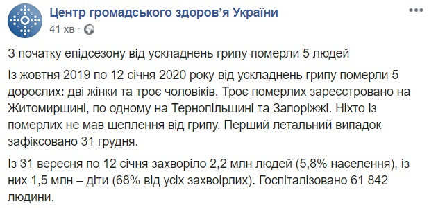Пресс-служба Центра отмечает, что с начала эпидемиологического сезона по 12 января этого года от гриппа умерли 5 человек: трое мужчин и две женщины. Сообщается, что по одному случаю было зарегистрировано на Тернопольщине и Запорожье, а в Житомирской области от вируса скончались 3 человека.