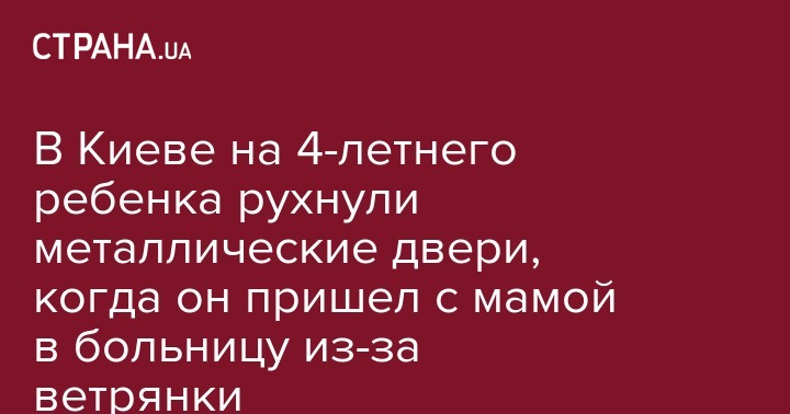 В Киеве на 4-летнего мальчика рухнули тяжелые металлические двери, которые находились в коридоре рядом с регистратурой детской поликлиники № 2 по проспекту Правды 64 А. Ребенок пришел в больницу вместе с мамой 13 января из-за ветрянки. Родные малыша просят помощи у очевидцев случившегося и всех неравнодушных людей, поскольку мальчику предстоит сложная операция по восстановлению тазобедренной кости. О случившемся сообщил Александр Суворов на своей странице в Facebook.